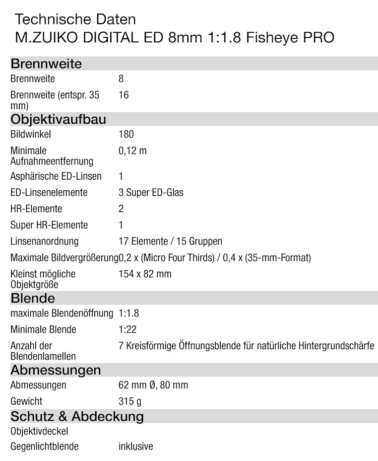 M.Zuiko Digital ED 1:1.8/8 mm Fisheye Pro Eigenschaften (Herstellerangaben):