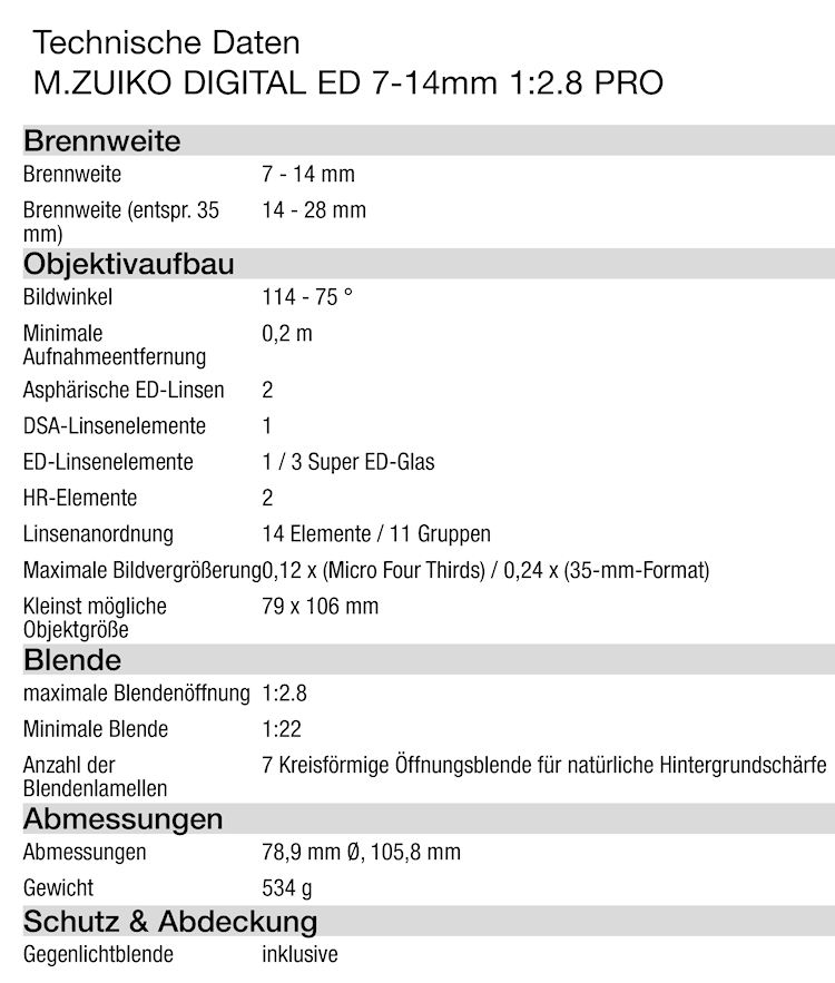 Olympus M.Zuiko Digital ED 1:2.8/7-14 mm Pro Eigenschaften (Herstellerangaben):