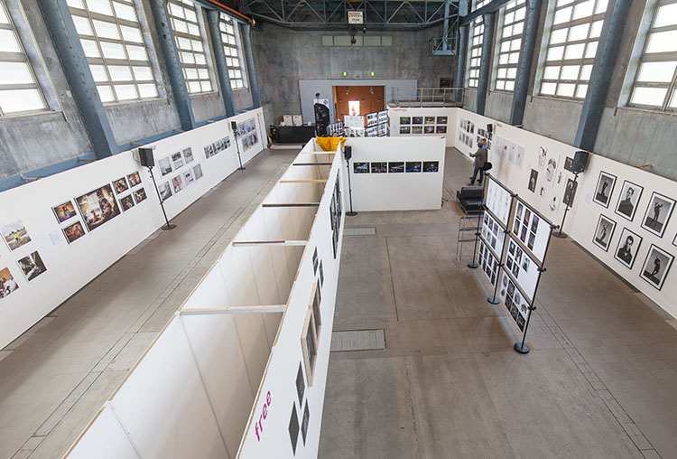 Die grosse Halle des Elektrizitätsunterwerks ist für die Ausstellung längs geteilt. An der Bretterwand rechts im Bild sind die Werbefotos für den Anlass «Zürich tanzt» gegenüber redaktionellen Aufnahmen aufgehängt.