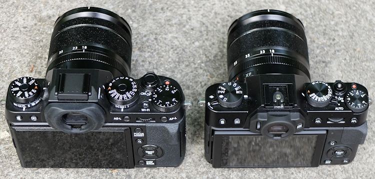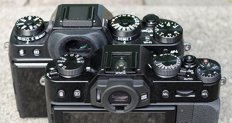 Die X-T10 (rechts) ist etwas kompakter und leichter als die professionellere X-T1, und durch ein anderes Konzept der Bedienelemente ist sie auf einfachere Handhabung ausgelegt.