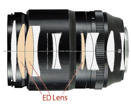 Das Fujinon XF 2,0/90mm R LM WR besteht aus 8 Gruppen mit 11 Elementen. wovon 3 ED Linsen