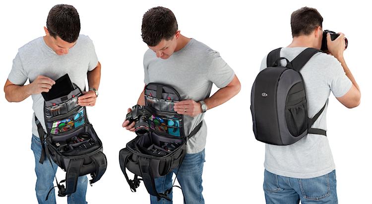 Rucksäcke, die von der Rückseite her zugänglich sind, sind besonders diebstahlsicher. Durch einen zusätzlichen Hüftgurt lassen sie sich beim Gebrauch nach vorne drehen (Foto Tamrac)