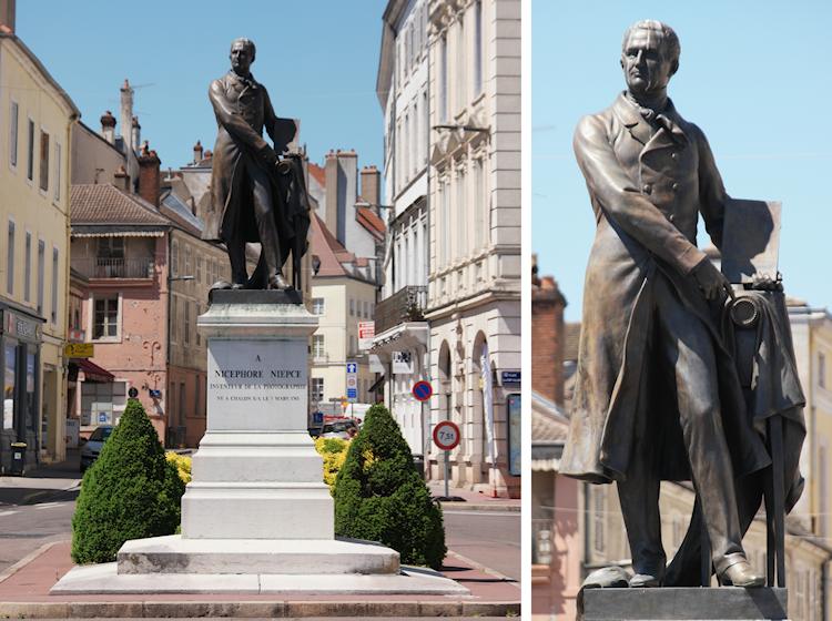 Man wird in Chalon-sur-Saône recht schnell auf Nicèphore Niépce aufmerksam, und offensichtlich ist das schmucke Burgunderstädtchen recht stolz auf den Erfinder der Fotografie. Am auffälligsten ist das Niépce-Denkmal, das mitten auf der Place du Port Villette steht und den Erfinder auf einem Sockel mit seiner Kamera in recht stolzer Pose zeigt.