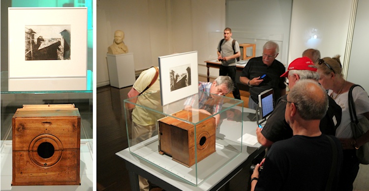Die Aufnahme entstand auf einer Zinnplatte, die mit sensibilisiertem Judäa-Asphalt bestrichen und nach stundenlanger Belichtung mit Lavendelöl haltbar gemacht wurde. Die entsprechenden Utensilien und Materialien sind hier ebenfalls ausgestellt, und Kurator Jean Louis Bruley erklärt uns diesen Prozess eindrücklich.