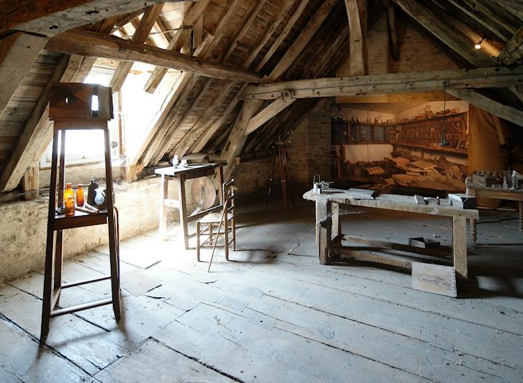 Wo die belichteten Platten präpariert und entwickelt wurden, sehen wir auf dem Dachboden. Hier befinden sich zwei Experimentierräume mit interessanten Objekten, welche die Besucher zeitlich um 200 Jahre zurück versetzen. Ob die Spinnennetze echt und wirklich aus der damaligen Zeit stammen? Jedenfalls beweisen die Löcher in den Holzböden, dass hier mit starken Säuren experimentiert wurde, und die eigenartigen Utensiien weisen darauf hin, dass sich Claude und Nicéphore nicht nur mit fotografischen, sondern mit vielen anderen Experimenten beschäftigen.