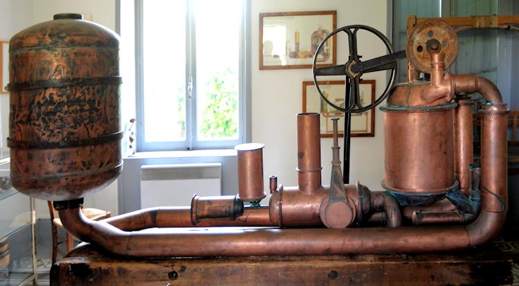 Der Nachbau des «Pyréolophore», einem Rückstoss-Verbrennungsmotor, in den die Brüder Claude und Nicéphore Niépce grosse Hoffnungen setzten – und viel Geld damit verloren. Mit dem Nachbau konnte die Funktionalität bewiesen werden. (Die Funktion ist hier auf YouTube auf Französisch erklärt)