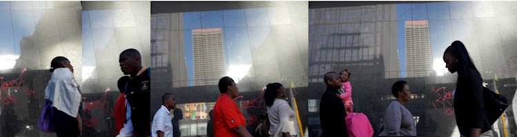 Catherine Gfeller. Die Schweizer Fotografin zeigt ihre Arbeit als Video, das in Südafrika entstanden ist, als beeindruckende Projektion. Sie zeigt in ihrem Werk die Schwierigkeit, sich im Getümmel von Johannesburg zu orientieren und zu Recht zu finden. (Grange à Ruth)