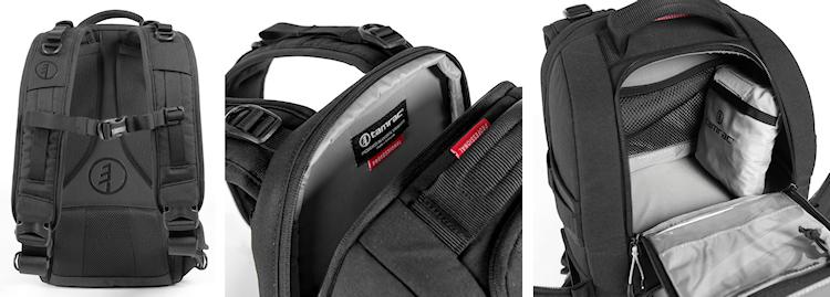 Der äussere Komfort setzt sich im Inneren des Rucksacks fort. Die Trennwände, die alle gepolstert, verstell- und einzeln herausnehmbar sind, lassen sich individuell an die Bedürfnisse und das Equipment des Trägers anpassen. Bei Bedarf können diese auch ganz entfernt werden. Auf der Innenseite des Front-Deckels befinden sich durchsichtige Zubehörfächer, die zum Verstauen von Filtern und anderem kleineren Zubehör genutzt werden, das damit steht’s im Blickfeld des Fotografen bleibt, wenn´s schnell gehen muss.