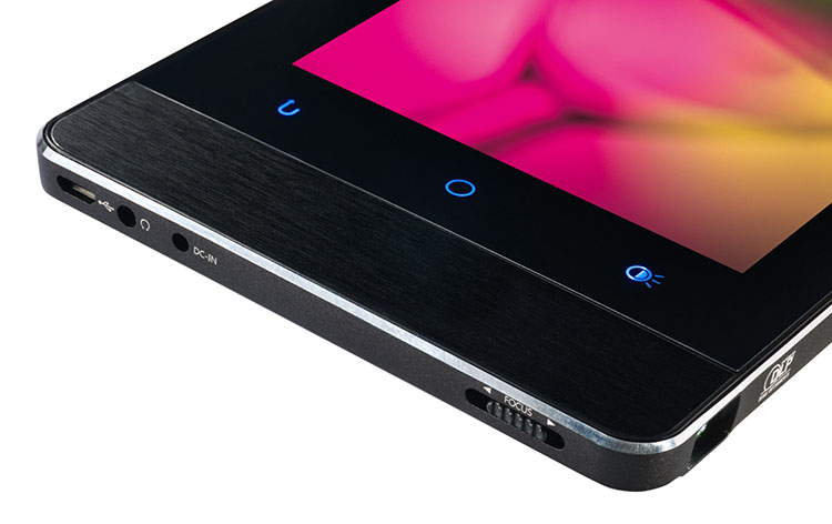 Aiptek P70 DetailIm Rand des Alu-Gehäuses sind Micro-USB-, Kopfhörer- und Netzanschluss auch ein Regler zur Fokussierung sowie eine Lautstärkenwippe eingelassen. Vorne rundet eine gebürstete Oberfläche um das Display, die Haptik des Beamer-Tablets ab. Das schwarze Aiptek ProjectorPad P70 misst 219 x 119 x 10 mm bei einem Gewicht von 420 g.