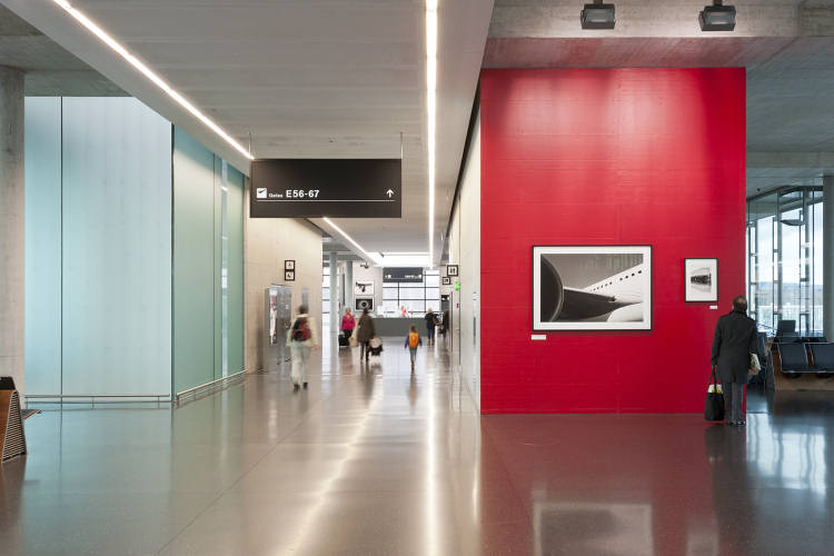 Ausstellung «Flugkörper» im Flughafen Zürich, Dock E, Christian Scholz, Zürich, Ostwand mit 2 Exponaten nahe Gate 55, hinten links Westwand mit zwei Exponaten nahe Gate 59/62. Ausstellungsphoto Dock E: © Christian Schwager 2015