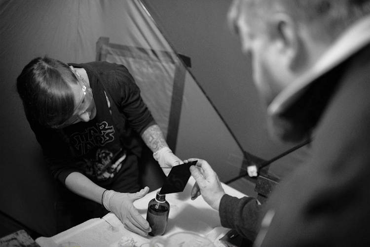 Zwei Gegenfragen: Im Zeitalter von Fertigpizzen: Kochen Sie wirklich immer noch selbst? Ich hoffe auch, dass Sie einen Liebesbrief von Hand schreiben, oder? In meinem Buch habe ich beschrieben, wie man es beim Nassplattenfotografieren vermeidet, sich die Finger schmutzig zu machen. Es ist ganz einfach. Ich weiss, es gilt als Kult schwarz befleckte Fotografenhände zu haben. Aber das sind in Wahrheit Verätzungen, das muss nicht sein.
