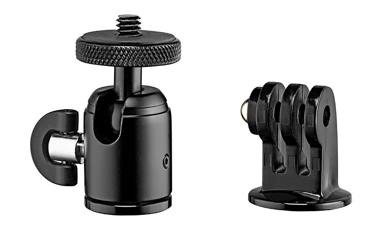 Links der Kugelkopf und rechts der GoPro-Adapter, die beide zum Lieferumfang des Stativsticks gehören.