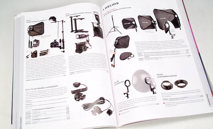 Den Helios Kompakt- und Studioblitzgeräten und dem dazu passenden Zubehörprogramm sind die Seiten 83 bis 97 gewidmet. Das System umfasst die beiden Gerätesysteme E und C und ein grosses Angebot verschiedenster Lichtwandler, von der grossen Softbox bis zum praktischen Spotvorsatz mit den verschiedensten Lampenstativen, sei es für den fixen Studioeinsatz oder die mobile Ausrüstung für unterwegs. Besondere Highlights sind das Helios Funkauslösersystem (Seite 87), der Fotostudio-Baukasten (Seite 93), das Lichtklappen-Set (Seite 88) oder das Klemm-Set auf Seite 95 bis zu den silbernen oder goldenen Faltreflektoren auf Seite 96-97.