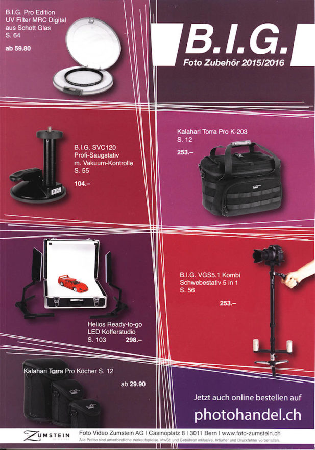 Jedes Jahr im Herbst erscheint der grosse Katalog des Zubehörspezialisten B.I.G. und präsentiert über 1000 nützliche Fotoartikel, mit denen neue Motivbereiche erschlossen und Fotoprobleme einfach gelöst werden können. Der Katalog kann physisch bei Foto Zumstein in Bern bestellt oder auf dessen Homepage als pdf heruntergeladen werden.