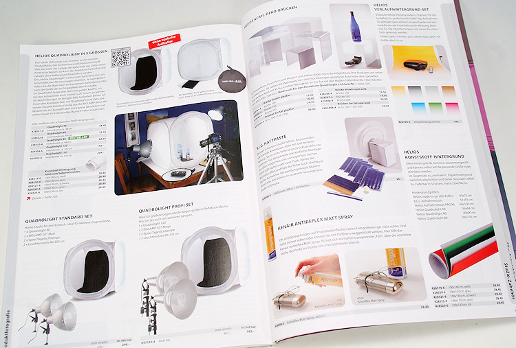 Die vielen Zubehöre im Katalog sind auch Ideenlieferanten. Da und dort entdeckt man einen nützlichen Artikel, der einem die Lösung für eine kreative Aufgabe ermöglicht oder einem inspiriert, sich mit einem neuen Fotobereich zu befassen. So ermöglicht das umfangreiche Helios Lichtsystem den kostengünstigen Einstieg in die Studiofotografie, auch wenn dieses halt vorläufig noch in der Dreizimmerwohnung improvisiert eingerichtet werden muss.