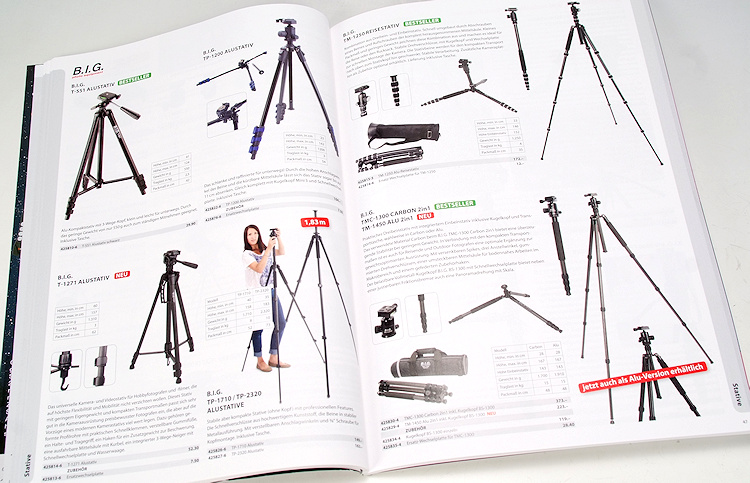 Das Angebot der Stative, vom kleinen Taschenstativ über das Reisemodell bis hin zum Profisystem, erstreckt sich im neuen B.I.G. Katalog über die Seiten 44 bis 57. Es umfasst sowohl das modular konstruierte Stativsystem Uni-Loc als auch viele Modelle der Eigenmarke B.I.G. in Aluminium- oder Carbon-Ausführung. Dazu jede Menge Stativköpfe für die verschiedensten Kameragewichte und praktischen Anwendungen. Im Moment besonders gefragt ist das B.I.G. Schulterstativ, das zum universellen Rig für die videofilmende Spiegelreflexkamera ausgebaut werden kann. Neu im Sortiment sind die preisgünstigen Zubehörteile zur GoPro Hero (Seite 58), welche die Abenteuerkamera sinnvoll und nützlich ergänzen.