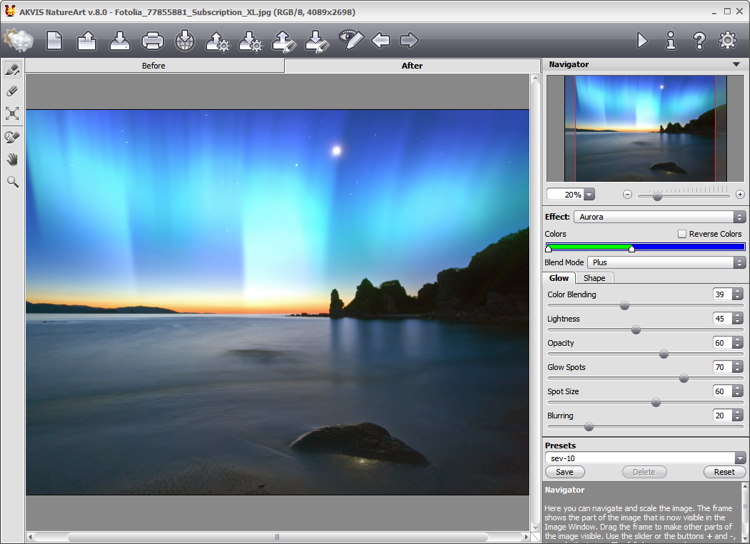 Neu hinzu gekommen ist der Nordlicht-Effekt. Die Nordlichter zeigen sich in der Natur als tanzende grünliche oder mehrfarbige Lichtschleier am Nachthimmel. Die Version 8.0 bietet diesen neuen Effekt mit speziellen Werkzeugen und einsatzbereiten Presets.