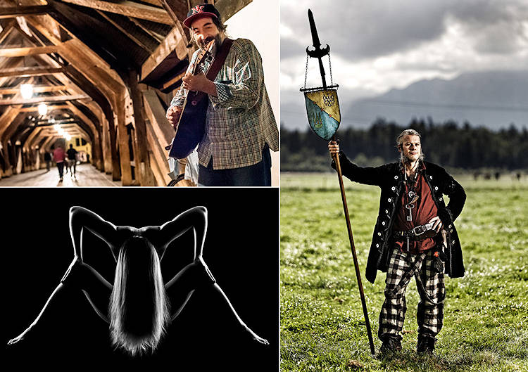 Oben: Der stadtbekannte Oltner Strassenmusiker Bernie auf der nächtlichen Holzbrücke (Roland Schöni). Links unten: Ein Bild aus der Serie «Shapes» von Nina Dick. Rechts: Eine Aufnahme von «Egalius vom Rumpel» aufgenommen von André Albrecht.
