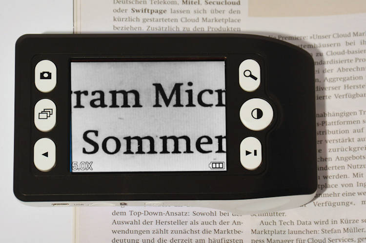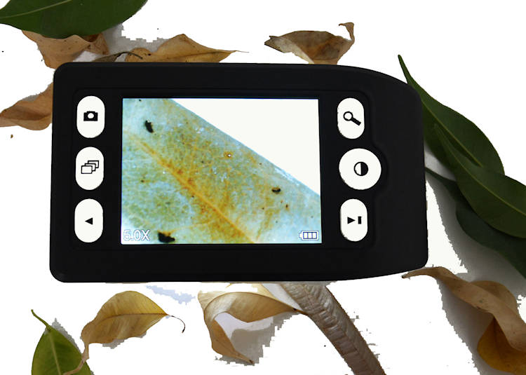Mit der «Freeze»-Taste kann der gewünschte Bildausschnitt eingefroren werden, um diesen dann in aller Ruhe lesen oder untersuchen zu können. Dabei verfügt das Display über eine Auflösung von 640 x 480 Pixel und drei verschiedene Farbmodi (Vollfarben, schwarz auf weiss und weiss auf schwarz). Die integrierte Kamerafunktion ermöglicht es, Schnappschüsse auf der Micro-SD Karte (nicht im Lieferumfang enthalten) zu speichern und per mitgeliefertem USB Kabel auf den PC zu übertragen.