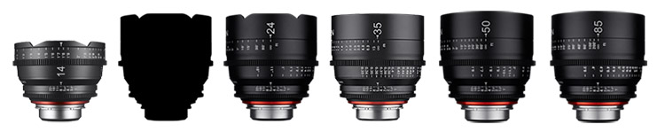 Die Xeen-Produktfamilie (vlnr.): 14mm T3.1, ein noch unbekanntes Weitwinkel, 24mm T1,5, 35mm T1,5, 50mm T1,5 und 85mm T1,5. Ausser beim 14mm mit einer Lichtstärke von T3,1 beträgt die Lichtstärke bei alle Objektiven jeweils T1,5.