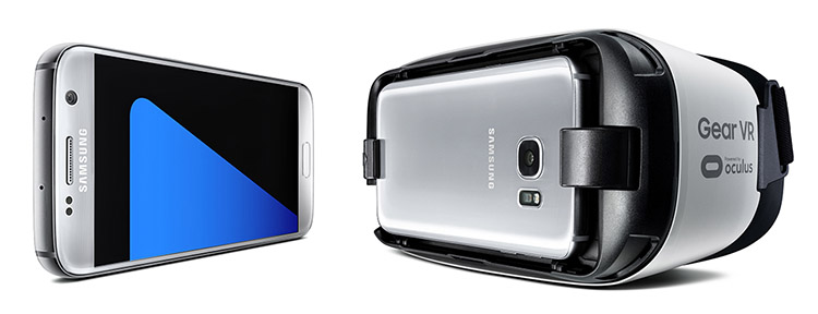 Samsung Galaxy S7 silbern neben der und eingesetzt in der Gear VR ermöglicht virtuelle 360-Grad-Videos zu betrachten.