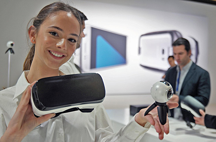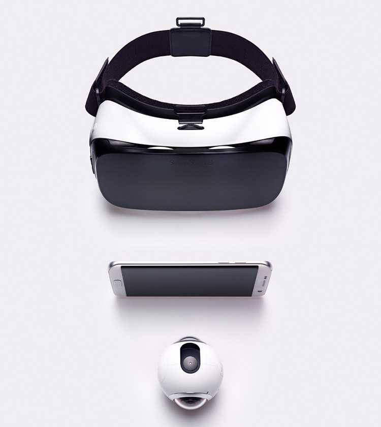 Mit der Brille Samsung Gear VR, in die eine Samsung Smartphone eingesetzt wird, lassen sich die Rundum-Ansichten der Kamera gear 360 in der virtuellen Realität betrchten. Je nach Kopfhaltung wird einen andere Ausschnitt des 360-x-360-Grad-Bilder (Fotos oder Videos) gezeigt.