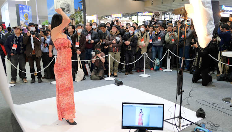 Auf dem Olympus-Stand, aber auch bei den meisten Kameramarken, demonstrieren Profis ihre Arbeitsweisen – was viele interessierte Fotoenthusiasten anzieht. Viele von ihnen sind mit beachtlichen Fotoausrüstungen auf der Messe unterwegs.