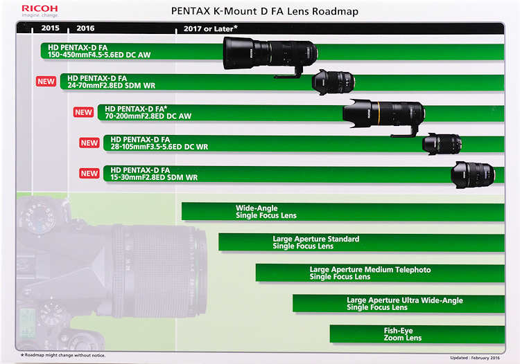 Zur Pentax K-1 gibt es neu die beiden Zoom-Objektive 2.8/24-70mm sowie das Telezoom 4.5-5.6 /150-450mm, sowie ein 2,8/15-30mm, ein 28-105mm und ein 2,8/70-200mm. Ferner können alle Objektive mit K-Bajonett an der K-1 benutzt werden, wobei nur die FA-Objektive das Format voll auszeichnen und die DA-Objektive das Format auf APS-C beschränken. Geplant sind in absehbarer Zukunft noch fünf Festbrennweiten mit gegenwärtig noch unbekannten Spezifikationen, wie einer am Stand präsentierten Roadmap zu entnehmen ist: