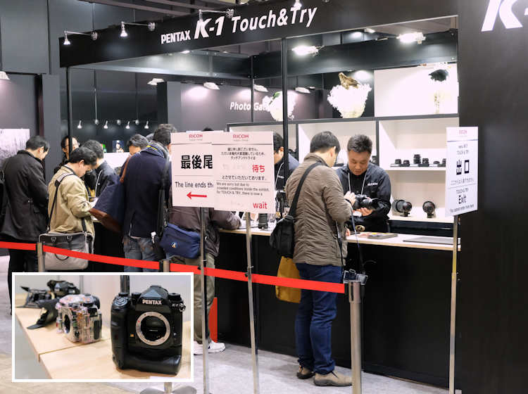 Eines der längst erwarteten Highlights ist die Pentax K-1 Vollformatkamera, die auch entsprechend unübersehbar am Stand präsentiert wird. Auf der letzten CP+ noch unter der Plexihaube ist sie jetzt marktreif. Als erste digitale Vollformatkamera von Pentax bietet sie eine Sensorauflösung von 36,4 Megapixel und stösst mit ihrem äusserst attraktiven Gehäusepreis von 2199 Franken auf grosses Interesse beim Publikum.