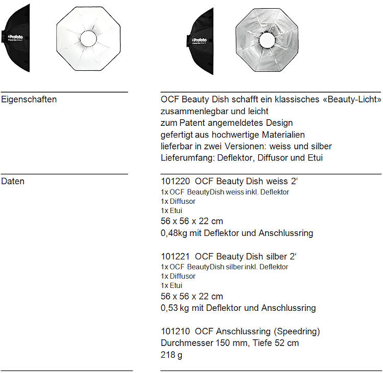 Den OCF Beauty Dish gibt es in zwei Versionen: in weiss und in silber. Die weisse Variante liefert ein etwas weicheres und gleichmässigeres Licht als sein silbernes Gegenstück. Der silberne bringt dafür ein etwas knackigeres, kontrastreicheres Licht. Beide werden mit Deflektor, Diffusor und Etui geliefert. Die beiden Beauty Dishes sind voll in das Profoto OCF-System integriert und passen an den B1 und den B2 Blitzkopf auch mit angesetzten Farbfolien. Sie können nicht mit anderen Profoto Kompaktblitzen oder Blitzköpfen verwendet werden.