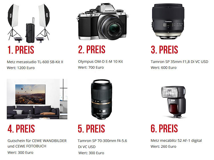 Zu den Sponsoren des Wettbewerbs zählen neben Metz die Kameramarke Olympus, der Objektivhersteller Tamron und der Online-Fotoservice CEWE. Als Gewinne winken Blitzsysteme, Kameras, Objektive und Gutscheine für Fotoarbeiten.