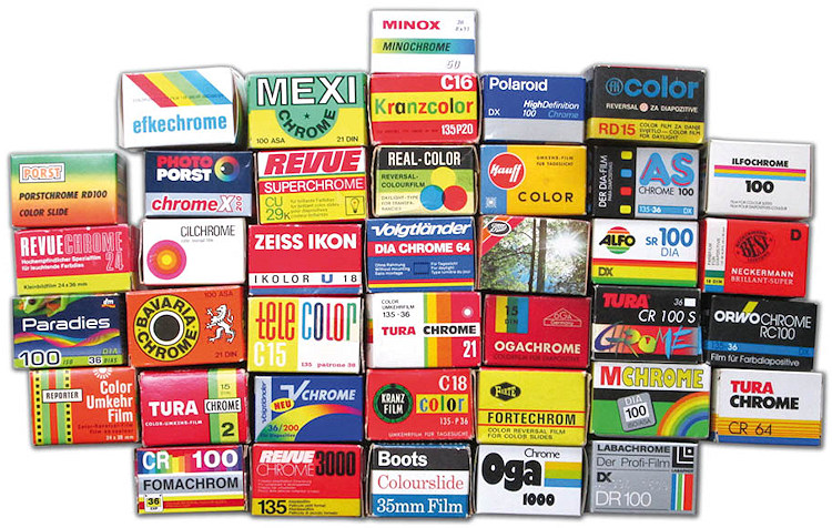 Die Packungen der Hausmarkenfilme waren oft fantasievoller gestaltet als die ihrer Originale. Ihre Herkunft liessen sie fast nie erkennen. Die Diafilme trugen zumeist auf die Silbe «chrome» endende Namen wie die kleine internationale Zusammenstellung zeigt. Das Foto zeigt auch einige Raritäten.