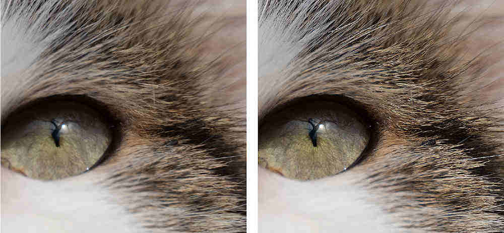 1:1 Ausschnitt ohne Nachschärfung (links) 1:1 Ausschnitt mit Nachschärfung (rechts) mit Photoshop («Unscharf maskieren» mit 130%/Radius 1.0)