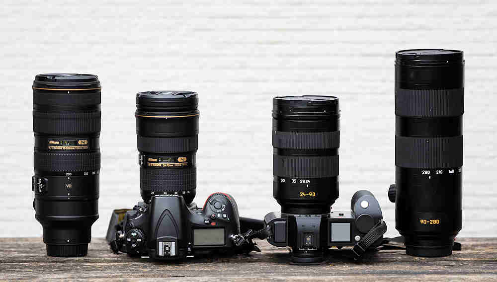 Die kleine Fotoausrüstung, links von Nikon, rechts von Leica. Sowohl die beiden Standardzooms wie auch die beiden Telezooms sind in den Dimensionen sehr ähnlich. Die Leica-Objektive fallen etwas länger aus und haben einen um 5 mm grösseren Linsendurchmesser. Da die SL schmaler als eine DSLR ist,  fällt die Gesamtlänge von Kamera mit Objektiv bei beiden Systemen praktisch identisch aus.