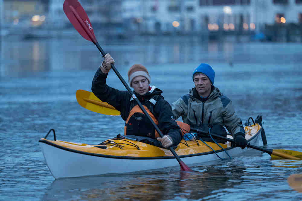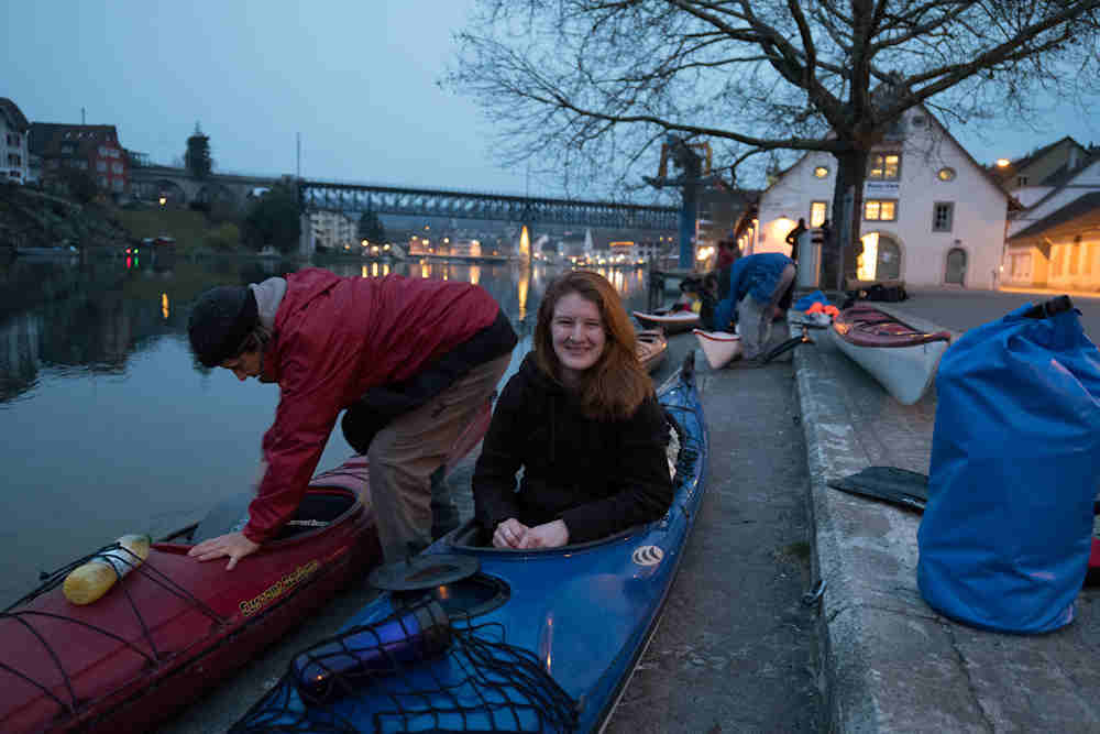 Morgens um 5:40 Uhr treffen wir uns am Rhein. Blue hour. Jeder bekommt sein Boot, die Spritzdecke und ein Paddel. Im ersten Morgenlicht schraube ich die ISO-Zahlen hoch …