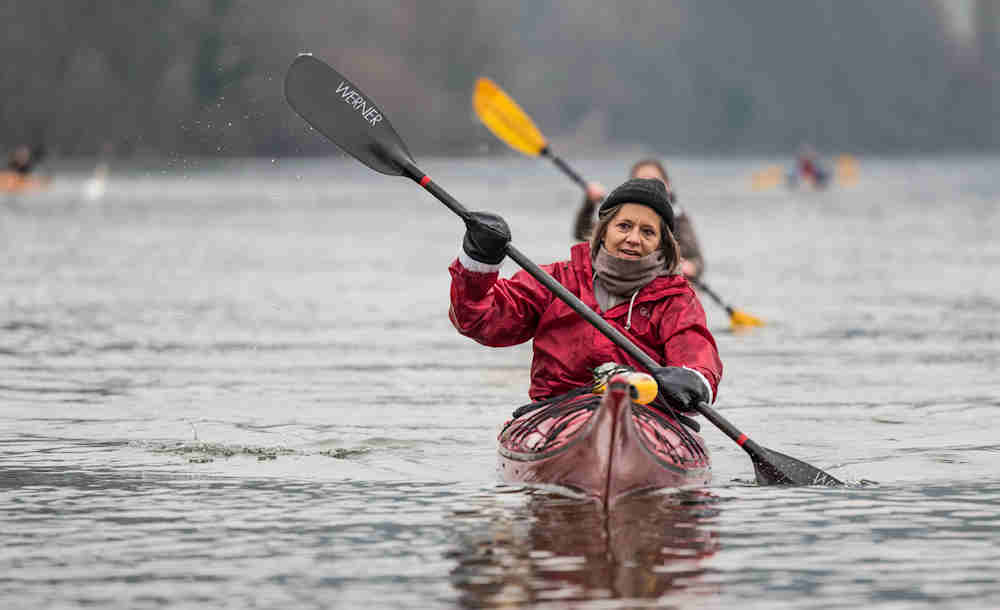 Ein Bild mit mehreren Kajakern wirkt dann top, wenn die beiden Paddel absolut synchron sind. Hier spielt die SL mit 11 Bildern pro Sekunde eine weitere Stärke aus. Ich stelle den Autofokus auf Verfolgung (AF-c), setze die Bildfolge auf «Serie schnell» und drücke den Auslöser durch, um dann das Bild zu wählen, bei dem die Paddelstellung der beiden Kajakerinnen perfekt ist. Weil die SL eine DSLM ist (spiegellose Kamera), rattert der Verschluss flüsterleise vor sich hin. Die kurze Verschlusszeit friert die Tropfen perfekt ein. Bei diesem Bild habe ich die Klarheit in Lightroom leicht erhöht, um den grafischen Look des Bildes etwas zu verstärken.
