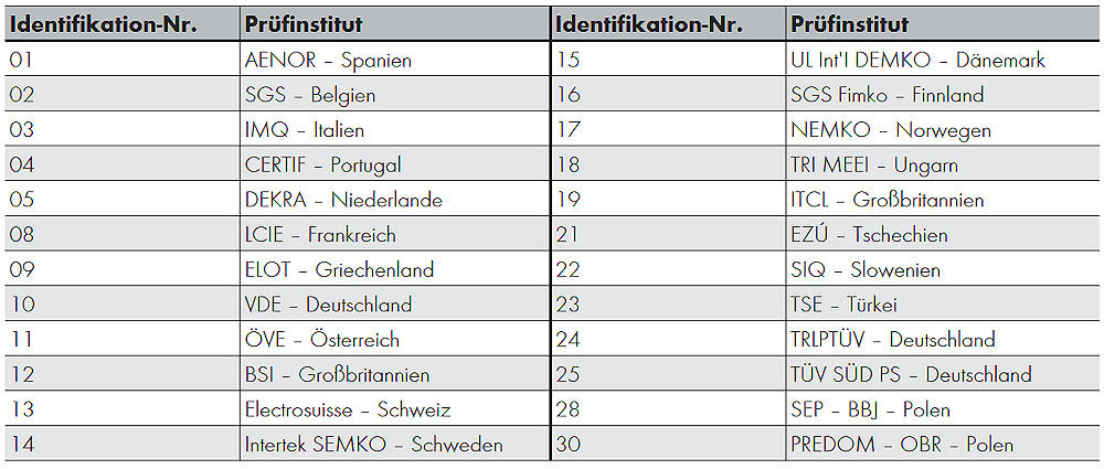 Die Zahl hinter dem ENEC-Logo ist die länderspezifische Identifikationsnummer des Prüfinstituts. Diese bedeuten: