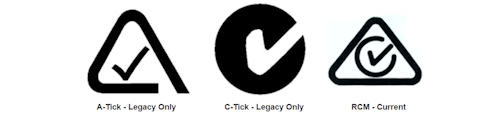 Prüfzeichen für Australien und Neuseeland zur Einhaltung der australischen EMV-Vorschriften. Das Logo ist obligatorisch für fast alle elektronischen Produkte die auf dem australischen Markt kommen. Zur Zeit erfolgt eine Umstellung vom bisherigen A-Tick (links) und C-Tick (Mitte) auf die RCM-Marke (rechts), die ab 1. März 2016 alleinig verwendet wird und das einzige Label in Australien sein wird, welches für die Einhaltung der Bestimmungen der «Australian Communications and Media Authority» (ACMA) für Telekommunikation, Radio, und elektromagnetische Energie. Weitere Infos unter www.compeng.com.au und www.metlabs.com