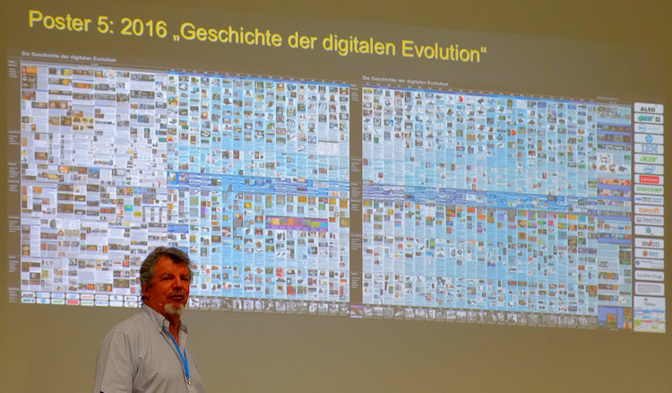 Ursprünglich sei geplant gewesen, das Poster in voller Grösse digital zu drucken, doch hätten sich dabei qualitative Probleme mit der Auflösung und der kleinen 6-Punkt-Schrift gezeigt, so dass man auf hochwertigen (und eben auch teureren) Offsetdruck übergegangen sei, erklärte Röbi Weiss bei seiner Präsentation in den Räumlichkeiten von HP in Dübendorf.