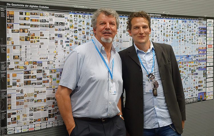 Gestern Abend präsentierten die IT-Experten Röbi und Micha Weiss die fünfte Auflage ihres Informationsposters zu rund 40 Jahren Geschichte digitaler Evolution. Das imposante Werk mit 256 cm Länge und 90 cm Höhe zeigt eine beeindruckende Datensammlung von der Vorgeschichte von Schrift und Zahlen über die Geburtswehen des PCs bis in die Gegenwart mit einem Ausblick in die Zukunft.