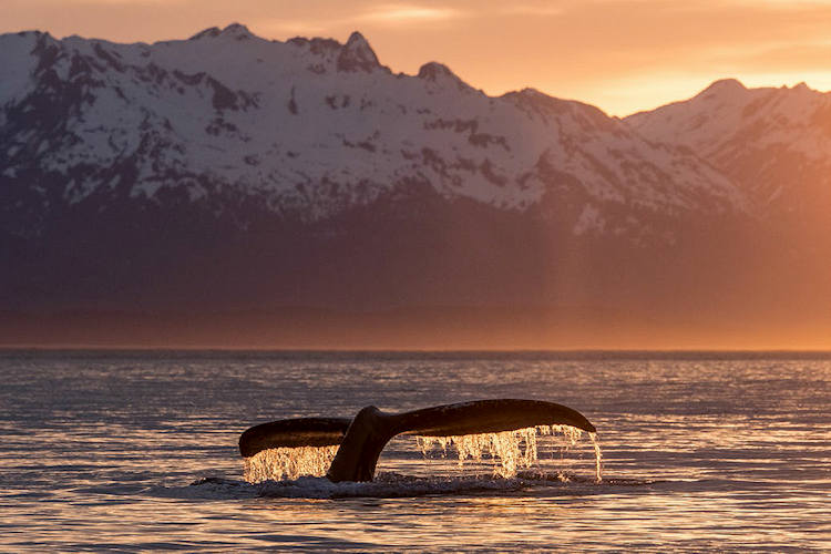 Über Frankfurt und Seattle geht die Reise nach Juneau, Alaskas Hauptstadt, die mich mit untypischem Wetter erwartet: Blauer Himmel, warme Temperaturen. Das muss natürlich ausgenutzt werden, und schon gleich am Abend fahren Lynn, Mike – ein US-Navy-Pilot und Arzt, der uns begleitet – und ich mit dem Skiff hinaus. Mehr oder weniger vor Lynns Haustür tummeln sich immer wieder Wale, und auch heute Abend ziehen zwei der grossen Riesen ihre Kreise. Es ist ein unbeschreibliches Gefühl, in der Nähe dieser sanften Wesen zu sein. Das Licht ist bereits am Schwinden, und die D500 muss beweisen, dass sie trotz kleinerem Sensor auch hohe ISO-Werte gut meistert. Und, yes indeed, der neueste Sprössling der Nikon Familie hält sich sehr gut. Selbst mit 20’000 ISO gelingen noch Aufnahmen, die ich für mein Projekt einsetzen kann. Und 20 Megapixel Auflösung reichen allemal sehr weit.