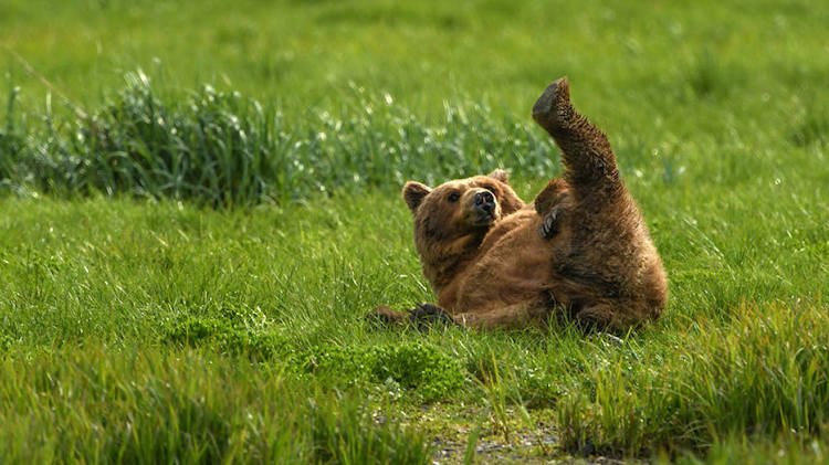 Be aware of the bear. Grizzlies sind keine Kuscheltiere, und wir lassen sie entscheiden, wie nah sie kommen. Dank Lynns grosser Erfahrung fühle ich mich sicher. Meister Petz konzentriert sich voll und ganz aufs Grasen (Foto: Lynn Schooler)