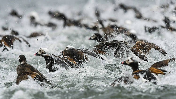 Eine herausfordernde Aufnahmesituation: Aus dem wackligen Skiff eine relativ weit entfernte abtauchende Gruppe von Longtail-Ducks fotografieren. Dank schnellem Autofokus und 9.5 Bildern pro Sekunde gelangen mir zwei oder drei Aufnahmen, mit denen ich happy bin Nikon D500 mit AF-S Nikkor 1:4,5–5,6/80–400mm VR auf 400 mm, 1/6400 Sek., f 5.4, 1400 ISO, freihändig aus dem Skiff Crop auf 16:9 für die Integration in den Film