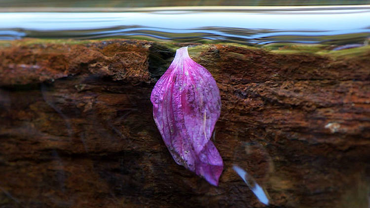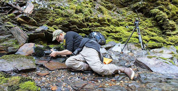Filmen und Fotografieren in extremen Positionen. Hier gilt es, ein kleines Blütenblatt, das sich im Wasserfall festgesaugt hat, festzuhalten. Es ist für mich eine der schönsten Szenen. Schon im Bild sieht das kleine Blatt unter dem Wasser unglaublich schön aus (s. Screenshot unten), und die Filmsequenz hat mit dem fliessenden Wasser über dem Blütenblatt eine ganz besondere Ästhetik. Dank dem schwenkbaren Monitor der D500 lassen sich solche Szenen problemlos festhalten (Foto: Mike McBeth)