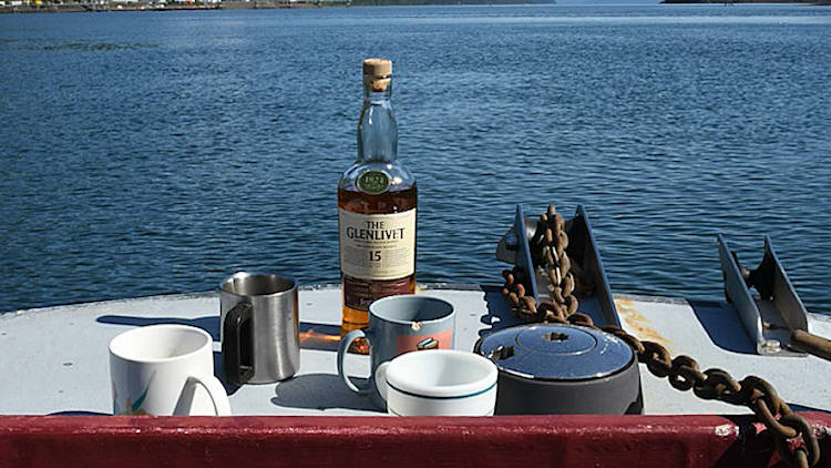 Die Berge sind alle noch schneebedeckt. Zahlreiche Gletscher kalben ins Meer und senden Eisschollen auf die Reise. Wir geniessen Whisky mit Gletschereis und saugen die wilde Landschaft in uns auf.