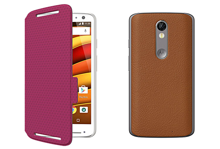 Moto X Force – links mit Frontcover und rechts mit Lederrückseite. Das Topmodell arbeitet mit einem Snapdragon 810-Prozessor mit 2,0-GHz-Octa-Core und besitzt ein bruchfestes Display (5,4” AMOLED mit 2560 x 1440 px, 540 ppi). An Bord sind eine 21 Mpx-Kamera (Blende 1:2.0 und Phasen-AF) für Fotos und Videos (4K/30p und 1080/60p).