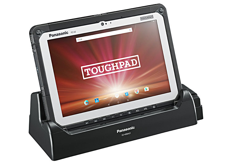 Das 10,1″-Geräte FZ-A2 (hier im Cradle) rundet die Android-Sparte der Toughpad-Tablet-Familie mit Geräten ab 4,7 Zoll nach oben ab. Das mobile Business Endgeräte soll komfortabel zu verwalten und zu nutzen sein sowie an spezifische Bedürfnisse von Einsatzumgebungen und von Nutzern angepasst werden können.