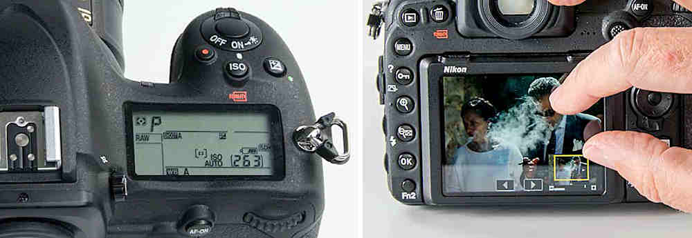 Praxisgerecht: Der ISO-Wert lässt sich blitzschnell per Knopfdruck umstellen (links). Mit dem Touchscreendisplay lässt sich das Bild bequem swipen und zoomen (rechts).