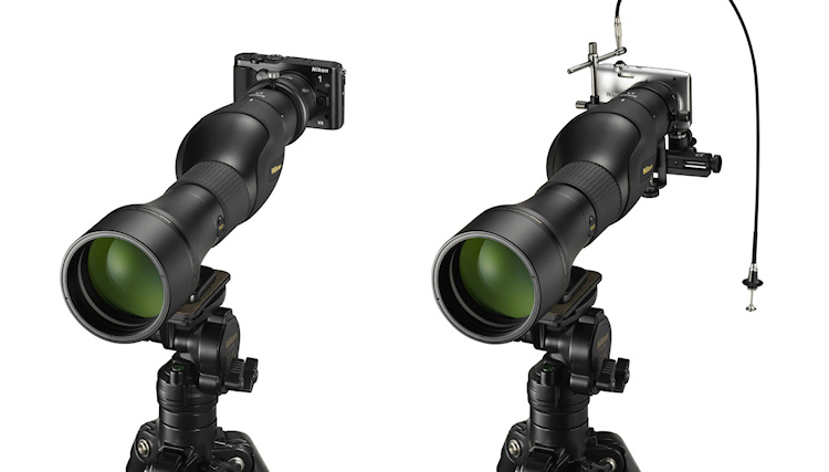 Mit einer Digiskopieschine und einem entsprechenden Adapter können Coolpix-Kompaktkameras oder die spiegellosen Kompaktsystemmodelle Nikon 1 an die Spektive angesetzt und so für extreme Teleaufnahmen der Beobachtungsobjekte verwendet werden.