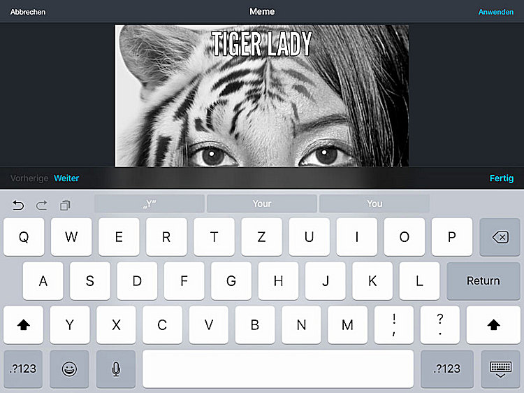 Photo Lab Pro eignet sich am besten für die Verarbeitung von Porträts. Deshalb gibt es auch nur ein wirkliches Werkzeug in diesem ganzen Programm, nämlich die Möglichkeit, ein Bild zuzuschneiden. Mehr Optionen gibt es nicht, entweder ein Filter passt oder er passt nicht. Und je besser das Porträt, umso besser passt auch der Filter darauf. Ganzkörperaufnahmen sind eigentlich ungeeignet, Brustbilder gehen mit Abzügen gerade noch so. Gesichter werden automatisch erkannt, ein Korrigieren der werksseitigen Einstellungen ist nicht vorgesehen und auch nicht möglich. Die Erkennung funktioniert bei einem kleinen Test aber ganz zufriedenstellend. Die Ergebnisse können sich sehen lassen, auch wenn der Tiger ziemlich viel vom Gesicht verdeckt. Was die App darüber hinaus noch mitliefert, sind alle möglichen Dinge, die man auf so ein Bild beziehungsweise auf eine Montage draufpacken kann, aber nicht muss: Beschriftungen und Sticker.